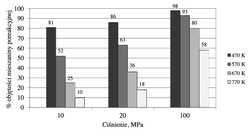 W wyniku pewnej odwracalnej reakcji chemicznej z dwóch substratów powstaje jeden produkt. Przemiana przebiega w fazie gazowej, co oznacza, że oba substraty i produkt są gazami. Reakcję tę przeprowadzono w zamkniętym reaktorze przy użyciu stechiometrycznych ilości substratów w różnych temperaturach i pod różnym ciśnieniem. Na poniższym diagramie przedstawiono, jaki procent objętości mieszaniny poreakcyjnej w reaktorze stanowiła objętość produktu tej reakcji w zależności od warunków temperatury i ciśnienia, w jakich przebiegała.
