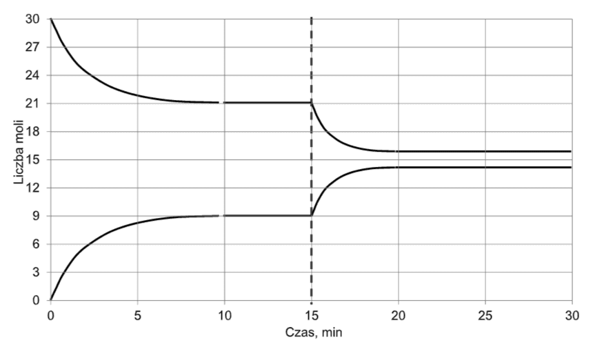 Na wykresie przedstawiono wyniki pomiaru liczby moli gazowych reagentów w trakcie trwania procesu oraz po ustaleniu się stanu równowagi w temperaturze T1. W piętnastej minucie eksperymentu zmieniono w układzie temperaturę na T2 wyższą od T1, czego konsekwencją było ustalenie się nowego stanu równowagi po dwudziestu minutach eksperymentu, co także zilustrowano na poniższym wykresie.