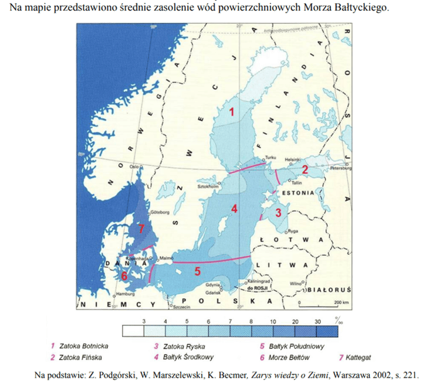 Zróżnicowanie zasolenia Bałtyku zostało przedstawione za pomocą