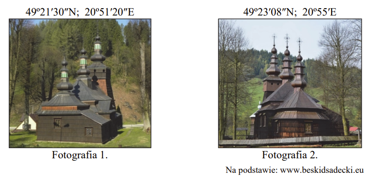 Zadanie wykonaj na podstawie fotografii przedstawiających obiekty sakralne znajdujące się na szlaku cerkiewnej architektury drewnianej. Przy każdej z fotografii podano współrzędne GPS obiektu.